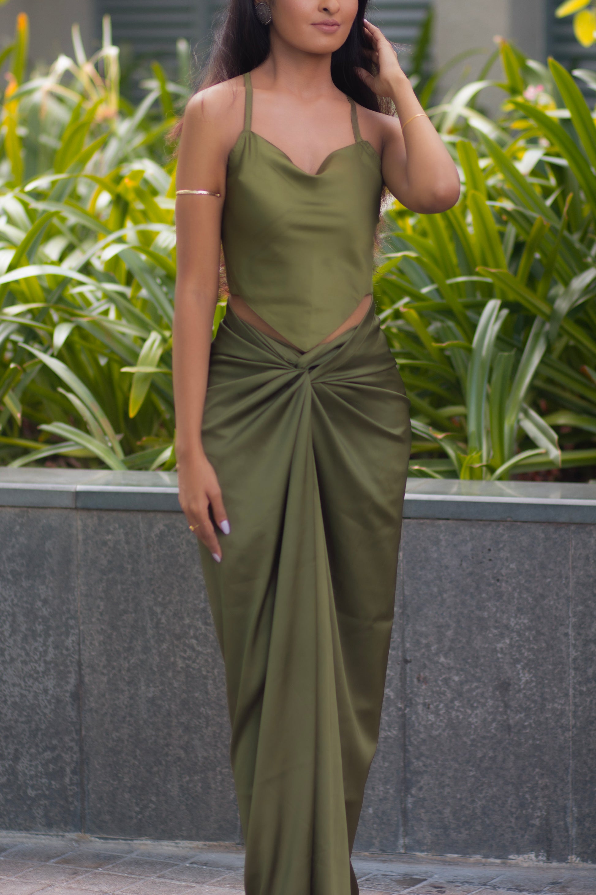 With its soft olive drape, delicate straps, and sculpted front knot, Calista flows effortlessly with every movement. Minimal, graceful, and naturally stunning — a dress made for quiet, timeless beauty.