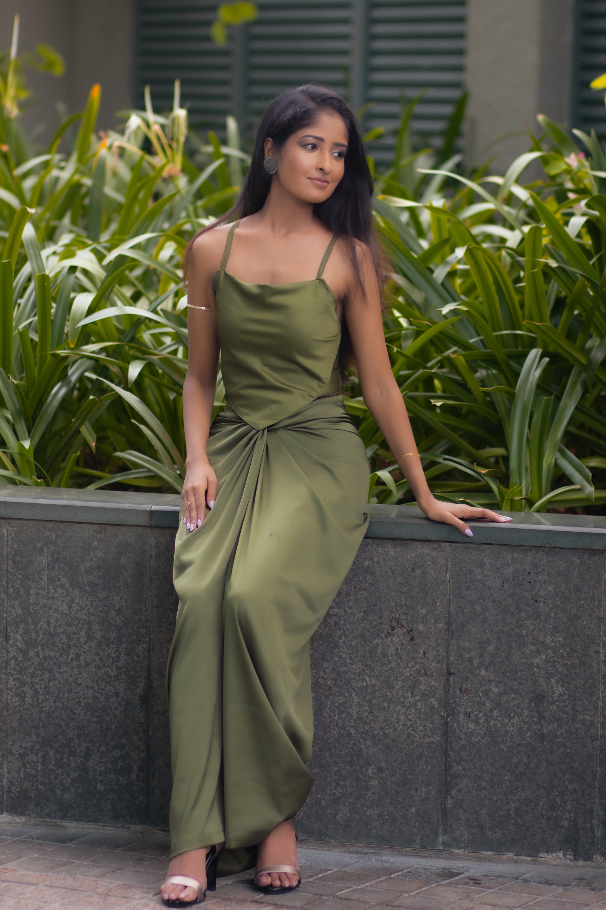With its soft olive drape, delicate straps, and sculpted front knot, cleo flows effortlessly with every movement. Minimal, graceful, and naturally stunning — a dress made for quiet, timeless beauty.