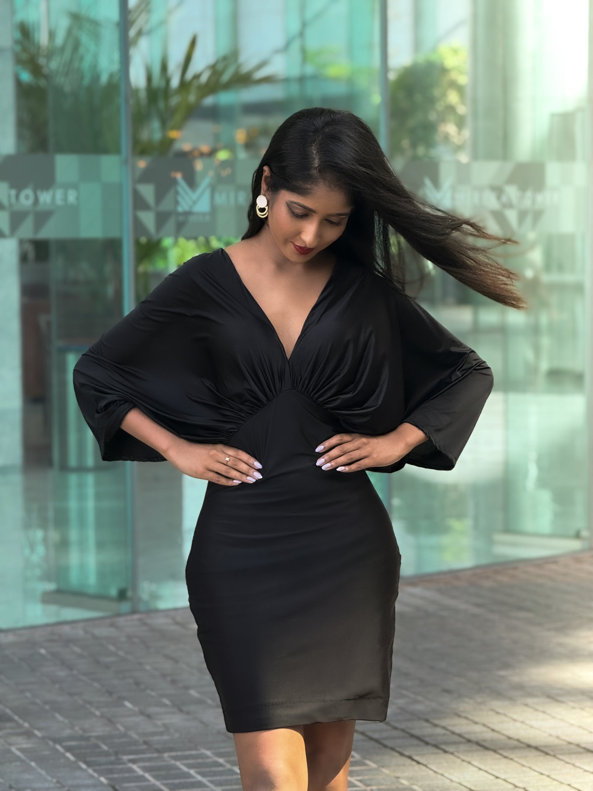 Grace meets allure in this stunning black bodycon dress, featuring soft drapes and a plunging neckline. A timeless silhouette crafted for bold, graceful moments.✨